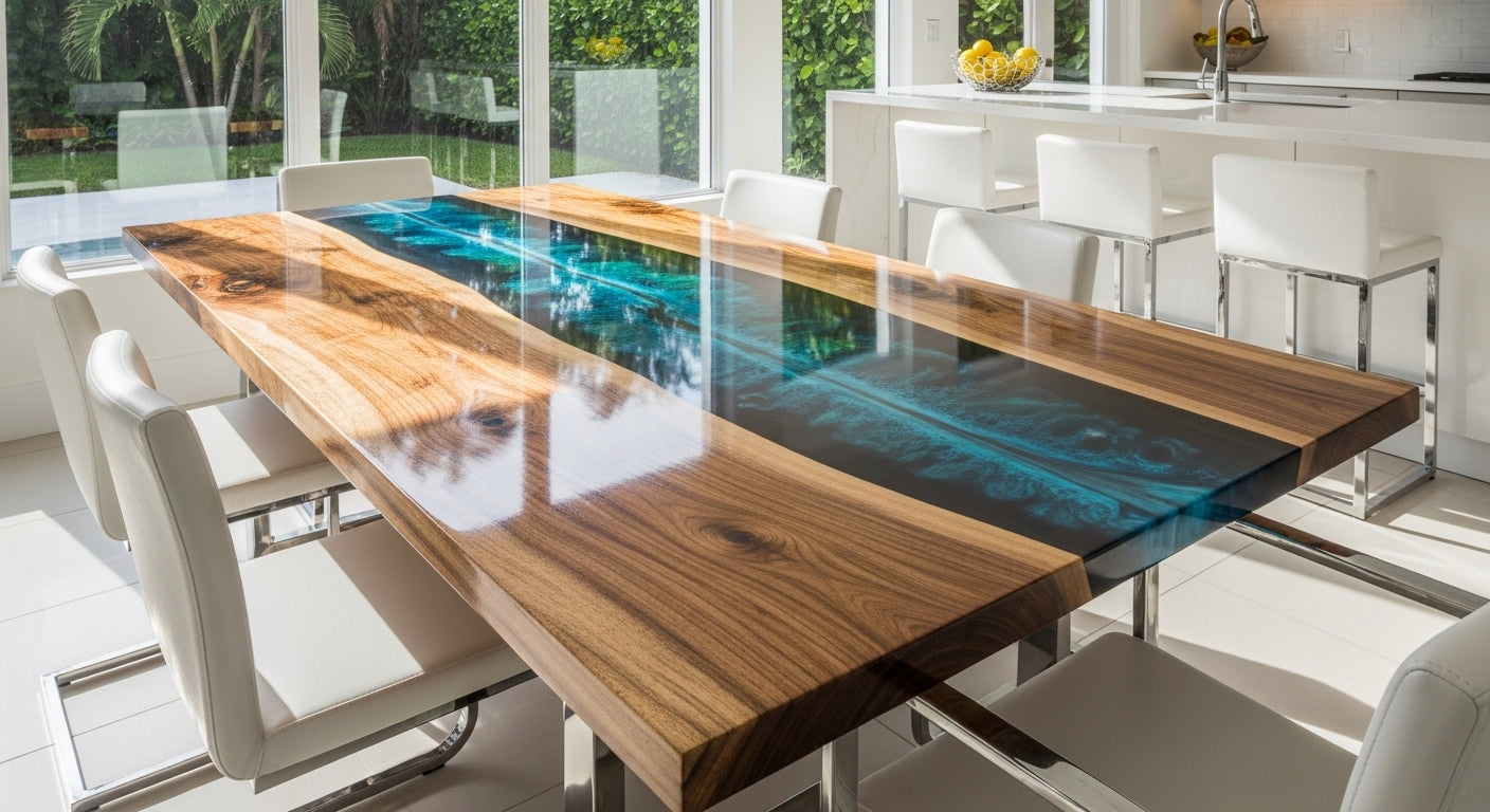 - Design Consultation: Select your epoxy color, style (river, ocean, or abstract designs), and finish. We’ll provide renderings to ensure the design aligns with your vision.