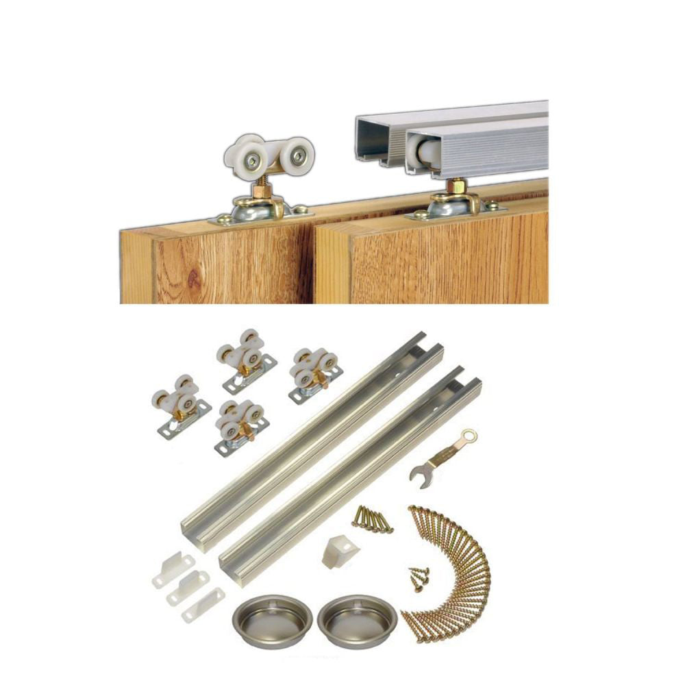 Complete Hardware Set: Includes two door slabs, steel rails, door hangers with wheels, door stops, floor guides, and all necessary mounting screws for a hassle-free installation.