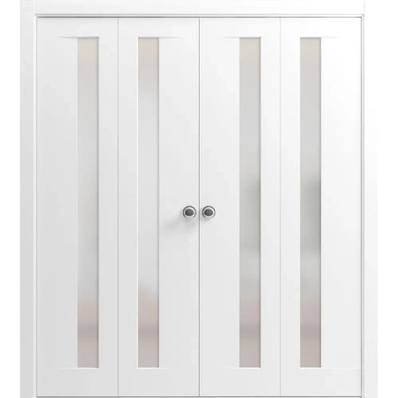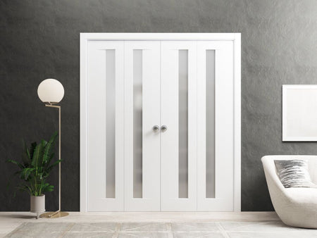Designed for function and style, each door features vertical frosted glass panels that add a refined touch while maintaining privacy. The bi-fold mechanism allows the doors to fold smoothly, offering a space-saving solution ideal for closets, room dividers, or compact areas.